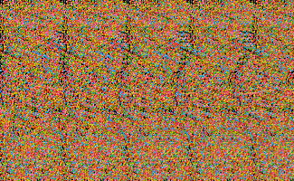 - вспомогательные точки. Намного проще "двоить" взгляд, если на стереограмме есть две вспомогательные точки, расстояние между которыми соответствует расстоянию между элементами узора. Рассеивая взгляд или плавно подбирая расстояние до стереокартинки, вы завставляете пару точек двоиться так, что их становится четыре. Но как только пара соседних точек соединятся, и покажется что точек только три - узор стереокартинки тоже совместится и должен проявить едва заметный размытый объем.