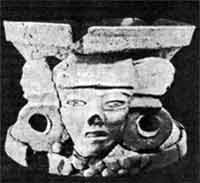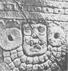 Наконец, весьма необычно для майяской архитектуры круглое в плане здание храма, обнаруженного недавно в Сейбале. Но круглые постройки довольно распространены в Центральной Мексике и на тольтекских памятниках Юкатана. Все это дополняет плоская каменная голова, так называемая "ача" (по-испански "топор"). Подобные изделия очень характерны для культуры племен Южного Веракруса и Западного Табаско конца 1-го - начала 2-го тясячелетия нашей эры.