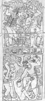 На стеле из Пьедрас-Неграса, относящейся к 795 году, такая триумфальная сцена запечатлена особенно ярко. В верхней части монумента изображен сидящий на троне правитель города-"халач виник" в пышном головном уборе и богатом костюме. Правой рукой он опирается на копье. У подножия трона стоят военачальники и придворные, а еще ниже - большая группа обнаженных пленников со связанными за спиной руками.