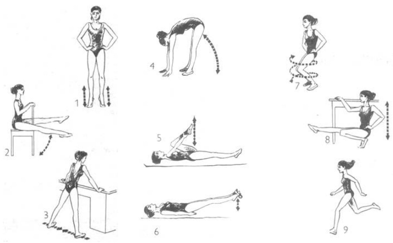 - И. п.-стоя, держась руками за спинку стула. Подняться на носки, затем "перекатиться" на пятки, загружая больше наружную сторону стоп; согнуть пальцы ног; вернуться в исходное положение. Амплитуда максимальная, темп медленный. Повторить 10-20 раз.