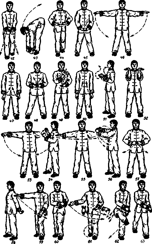 Встаньте прямо. Левая нога делает полшага вперед. Правая рука вытягивается в сторону - вправо, ладонь обращена вверх. Левая рука согнута в локте, ладонь обращена вниз и располагается перед даньтянь. Произведите короткий неполный выдох (рис. 59). Правая рука сгибается в локте, ладонь идет влево, останавливаясь над левой ладонью. Левая ладонь обращается вверх. Одновременно сделайте глубокий ровный вдох (рис. 60). Правое предплечье проворачивается внутрь таким образом, что правая ладонь обращается вниз. Завершая движение влево, правая ладонь делает хлопок по левой ладони сверху. Затем на мощном выдохе сделайте рубящее в горизонтальной плоскости движение правой ладонью слева направо. Во время рубящего удара ладонь обращается вверх. Делайте выдох со звуком «хай» (рис. 61). Повторить 6 раз.