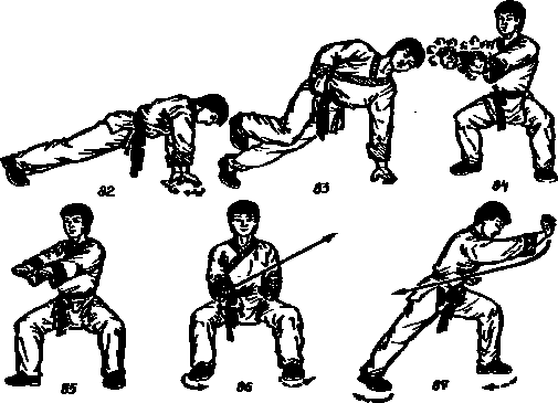 Медленно сделайте вдох носом и представьте, как ци проходит в даньтянь. Затем - резкий выдох, направляя ци в пальцы рук. В этот момент пальцы немного захватывают землю, но не сдвигаются с места. На выдохе издайте негромкий звук «хэ», исходящий из живота (рис. 82).