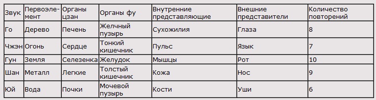 В цигун существует «метод шести иероглифов» - люцзыфа. Шесть иероглифов, или, точнее, шесть звуков, связаны с шестью типами ци - ци печени, почек, селезенки, легких, сердца и «тройного обогревателя».