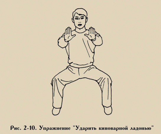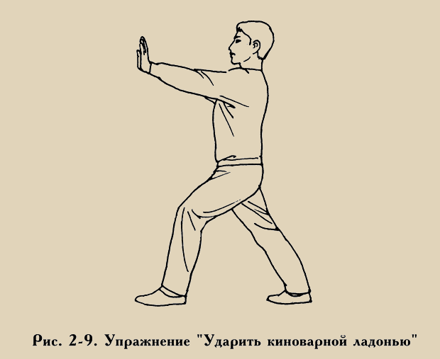Базовые инструкции: Это название связано с покраснением ладоней в результате концентрации в них ци; киноварь (чжуша) - растение красного цвета, используемое в китайской медицине. Приняв позу "шаолиньский столб", поднимите руки вперед до уровня плеч (расстояние между ними остается равным ширине плеч), направив ладони вперед, большими пальцами друг к другу (рис. 2-9).