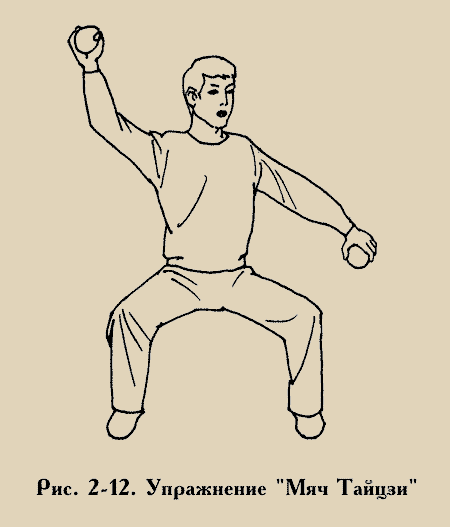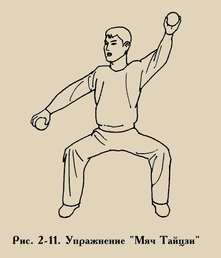 Базовые инструкции: Принять позу "шаолиньский столб", держа в каждой руке по круглому мячу с песком, весом порядка 3, 5 кг. Сначала двигать руки по кругу рядом с туловищем влево и вправо и затем поднять их вверх и опустить вниз не менее 100 раз (рис. 2-11).