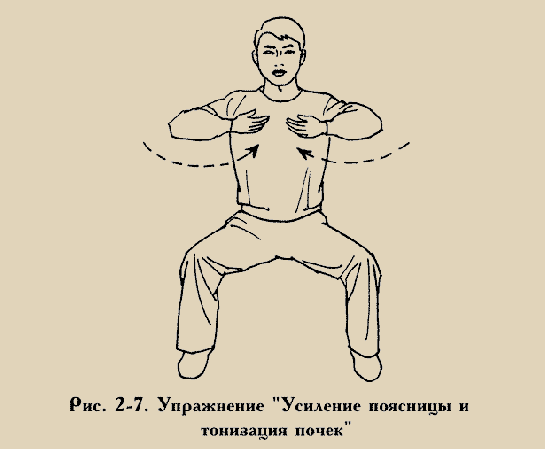 Базовые инструкции: Примите позу "шаолиньский столб" и, двигая руками от живота к подмышкам, опишите ими окружность. С помощью ладоней обеих рук ци собирается и направляется к нижней части спины. Затем, прикасаясь и нажимая на область почек обеими руками введите ци в задний даньтянь (ворота жизни - центр в точке минмэнь - Ц. Х.). Движение ци регулируется с помощью концентрации сознания. Повторить 9-18 раз. Дыхание должно быть естественным (рис. 2-7).