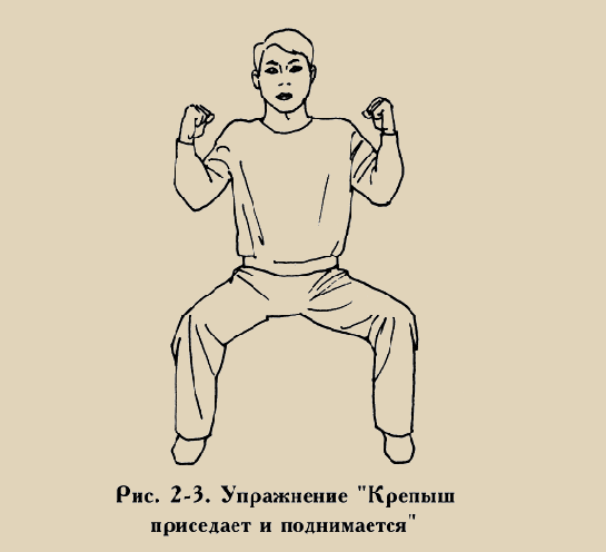 Базовые инструкции: Встать прямо, ноги на ширине плеч, вес тела распределен на обе ноги поровну. Первым движением присесть вниз, одновременно сжав кисти рук в кулаки и согнув локти (рис. 2-3, 4), и затем подняться. Даньтянь-ци проводится и концентрируется в кулаках и ступнях, внимание сосредоточено сначала на ладонях, а затем вместе с движением ци перемещается через даньтянь и ноги к ступням. Дыхание должно быть ровным, мягким и координироваться с движениями тела. Упражнение повторить от 9 до 18 раз.