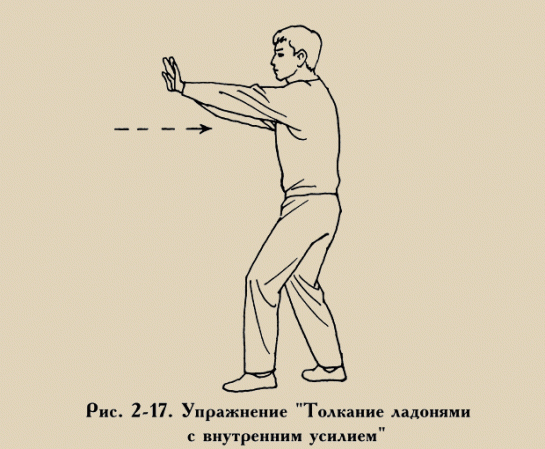 Одновременно перемещайте даньтянь-ци в руки и ладони: объедините и сконцентрируйте сознание, ци и силу на толкании стены. Усилие, прикладываемое ладонями должно быть устойчивым, но мягким. Затем опустите ваш центр тяжести вниз и естественным образом перемещайте ладони назад и вперед (рис. 2-18). Ритм дыхания и порядок концентрации сознания должны координироваться с темпом движения рук; занимающийся должен стоять устойчиво и избегать падений при перемещении тела назад и вперед.