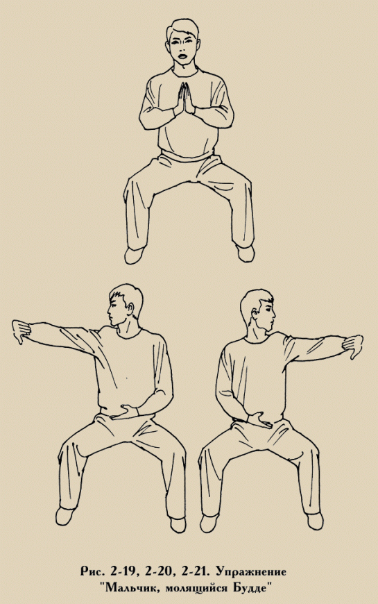 Базовые инструкции: Примите позу "шаолиньский столб". Руки свободно опустите по бокам туловища и затем постепенно поднимайте их через стороны к груди, соединив ладони вместе; точки лаогун (PC 8) обеих рук должны соприкасаться друг с другом; концы пальцев рук располагаются на уровне плеч (точка даньчжун (RN 17) ); локти слегка согнуты, образуя с грудью небольшой круг, подобно тому как это делает молящийся мальчик (рис. 2-19).