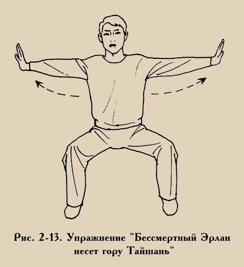 Базовые инструкции: Принять позу "шаолиньский столб" и проводить даньтянь-ци в обе руки и ладони. Производя ладонями толкающие движения, вытянуть руки в стороны. Сконцентрированное сознание при этом перемещается вдоль медиальной стороны рук в точки лаогун (PC 8) в центре ладоней. Затем встряхнуть руки вверх и вниз и развернуть ладони, приняв позу поддерживания, как будто вы пытаетесь нести на плечах гору Тайшань (рис. 2-13). Повторить движения 9-18 раз.