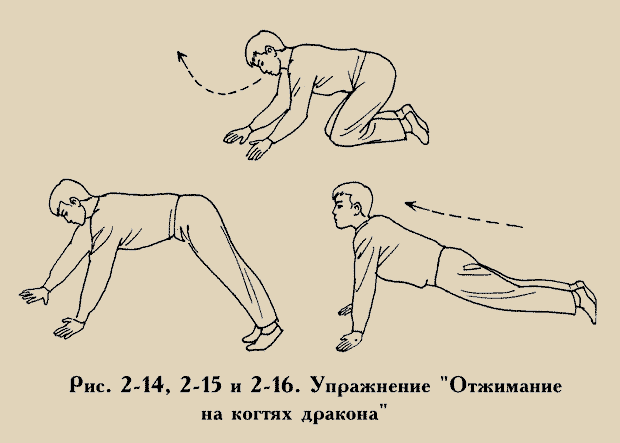 Базовые инструкции: Лечь на пол, опершись на ладони и пальцы ног, таким образом, чтобы грудь, живот и бедра находились над полом. Затем выпрямить спину, как показано на рисунках (рис. 2-14, 2-15, 2-16). Достаточно сильные и тренированные люди могут опираться на пять пальцев рук (или даже на три или два пальца) для поддержания тела над полом. Упражнение можно повторять от 9 до 18 раз, в зависимости от физической подготовки и возраста занимающегося.