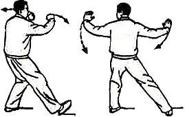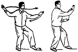 1. Медленно перенести вес тела на левую ногу и повернуть корпус влево (6 часов). При этом развернуть носок правой стопы вовнутрь. Одновременно раскрыть оба кулака, разводя кисти по дугам в стороны ладонями наружу. Смотреть на левую кисть (рис. 119-120).