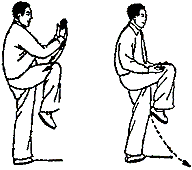 4. Медленно вынести правое бедро вверх. При этом правая кисть раскрывается и выносится вперед мимо наружной части правого бедра. Одновременно вести левую кисть вниз, в сторону от левого бедра. Ладонь направлена вниз. Локоть правой руки в конечном положении находится над правым коленом, пальцы направлены вверх, ладонь обращена влево. Смотреть на правую кисть (рис. 130, 131).