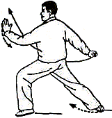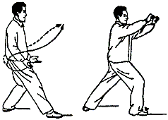 З. Повернуть пальцы левой стопы наружу, а правой - вовнутрь. Выпрямить правую ногу, согнув левую, на которую переносится вес и слегка повернуть корпус налево (3 часа), медленно поднимаясь в движении вперед. Одновременно вести левую кисть пальцами вперед, ладонь обращена вправо. Правая кисть находится за спиной в форме “крюка”, кончики пальцев обращены назад. Смотреть на левую кисть (рис. 129).