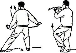 2. Поставить правую стопу в направлении 10 часов, медленно переместив вес тела на правую ногу и принимая правую позицию “лук-стрела”. Одновременно кисти рук пронести по дугам назад и медленно сформировать их в кулаки вращением наружу с последующим их выносом вверх и вперед для “клещеобразного” движения. Кулаки заканчивают движениена уровне ушей в 10-20 см друг от друга. Костяшки кулаков направлены вверх и чуть назад. Смотреть в направлении выноса рук (рис. 117-118).