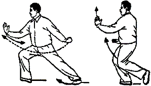 1. Немного развернуть корпус вправо (10 часов) и вести левую кисть пальцами вверх мимо правого запястья ладонью на себя. При этом правая рука остаются на месте. Одновременно с началом разведения кистей в стороны поднять левую стопу и сделать шаг вперед к 8 часам для левой позиции “лук-стрела”. Стопа устанавливается на пол развёрнутой носком наружу. Ладони направлены от себя. Смотреть перед собой (рис. 109-111).