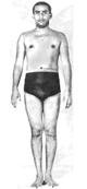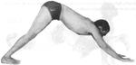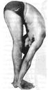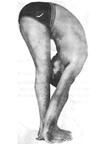 Выдыхая, наклоняйтесь вперед, пока руки не окажутся на одной линии со ступнями ног. Головой коснитесь колен. Вначале колени можно слегка сгибать, чтобы легче было коснуться их головой. После некоторой тренировки колени должны оставаться выпрямленными.