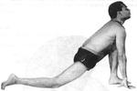 Выдыхая, опускайтесь на пол. В этом положении, известном как саштанга-намаскар, или положение с восемью изгибами, только восемь частей тела касаются пола: две ступни, два колена, две руки, грудь и лоб. Область брюшной полости поднята, носом по возможности тоже старайтесь не касаться пола, касается только лоб.