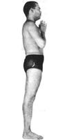 Станьте прямо лицом к солнцу. Соедините руки перед грудью (намаскара мудра) и селайте полный выдох. Стопы ног при этом должны быть вместе, или слегка расставлены в стороны, а спина находится в прямом положении. Сосредоточьте свое внимание на мудре, осознание должно удерживаться на силе ладоней и на эффекте от этой мудры в области груди.