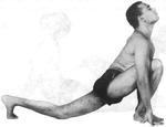 Делая вдох, перемещайте правую ногу назад, как бы делая большой шаг. Руки и левая ступня твердо упираются в пол, голова отведена назад. Левое колено должно находиться между руками.
