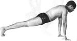 Сделайте вдох и задержите дыхание. Отведите левую ногу назад, так чтобы обе ступни находились рядом. Колени оторваны от пола. Опирайтесь на кисти рук (руки прямые). Тело должно представлять прямую линию от головы до пят.