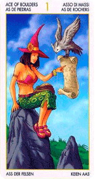| «Таро ведьм» | Колоссальный заряд энергии и наличие фундамента из знаний, возможностей, талантов, опыта и умения верно прогнозировать результат своих действий, делает человека, в раскладе которого присутствует эта карта, просто обреченным на успех. Также ведьминский Туз Валунов (Пентаклей) сигнализирует о какой-то новости, которая будет способна полностью изменить ход дела | ![]() |