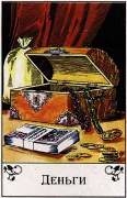 | Деньги | ![]() | Предвидится повышение зарплаты или увеличение прибыли, получаемой от частного бизнеса. Это обеспечит достаточным количеством средств для безбедного существования и позволит уделять больше внимания любимому человеку. В сфере отношений эта карта характеризует богатого мужчину или обеспеченную женщину, которые готовы помочь своему более бедному партнеру в решении материальных проблем |
