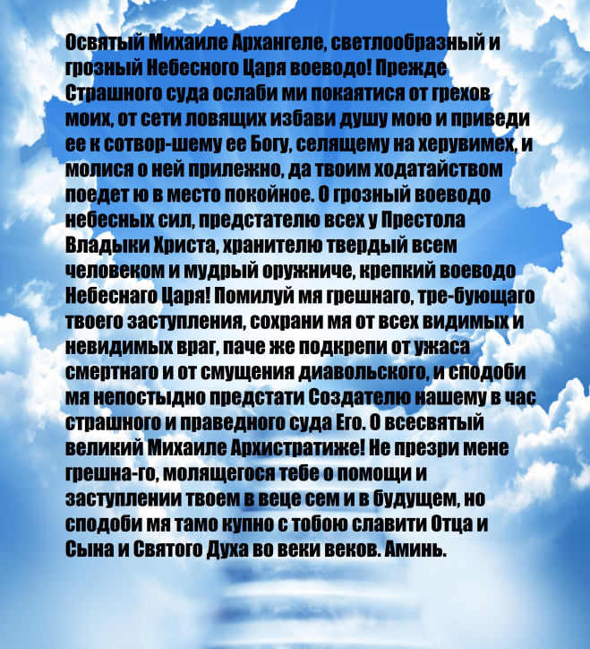Молитва является очень сильной и была написана на паперти церкви Архистратига Михаила Чудового монастыря в Кремле. Считается, что если этот текст по одному разу каждый день, то человек будет защищен силами Святого на всю оставшуюся жизнь. Архангел Михаил может также помочь родным и близким людям.