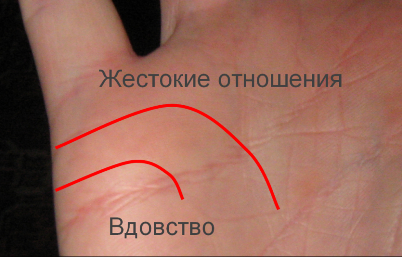 - Полоса брака опускается к линии сердца - его хозяин овдовеет. По длине черточки и расположению возможно определить примерный возраст трагедии