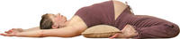 Садись между пятками или на пятки. Мягко ложись на спину, опираясь на руки, заранее подложив подушку под поясницу для более эффективного расслабления. Дыши животом.