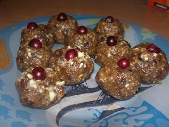 Все перемалывается в миксере примерно 3 к 2. Лепятся шарики и украшаются клюквой. Можноиспользовать абсолютно любые орехи. А вместо изюма можно чернослив.