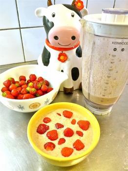 Итак, нам понадобится 3 крупных инжира, горсточка миндаля, банан и стакан (250 мл) воды. Закидываем это все в блендер и на мощной скорости делаем из этого однородную массу. Должна получиться водянистая консистенция белого цвета. Пробуем, добавляем мёд и снова пробуем. Добавляем немного клубники. Приятного аппетита!