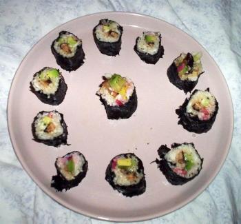 Теперь турнепсный рис замариновался, я опять со всей силой отжала из него жидкость. Дальше делала как в обычном рецепте суши: на листок нори положила слой турнепса где-то до половины, потом вдоль начинку - замаринованный, обьмякший шиитаке, огурец, авокадо, порозовевший имбирь - и завернула с помощью коврика. Когда не было коврика, фальгой пользовалась, но коврик в китайском магазине копейки стоит.