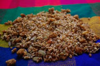 Гречка, подсолнечные и тыквенные семечки замочены, пророщены сутки. Грецкие орехи замочены на несколько часов, грубо размолоты. Мак, кунжут добавлены просто так. Мускатный орех потерт на тёрке. Из морковки сделан сок, а жмых добавлен в гранолу. Всё, кроме шелковицы, хорошо смешано в своём влажном виде и просушено сутки в сушилке. Потом добавлена шелковица. Поедалось с миндальным молоком.