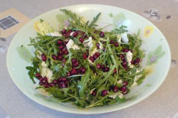 Берем китайский салат и вольно нарезаем (можно даже порвать руками), шинкуем также петрушку с укропом, а вот листочки рукколы можно оставить целыми. Перемешиваем все ингредиенты и добавляем по вкусу оливковое масло или орехово масло. Крошим в емкость гранатовые семечки и перемешиваем снова. Приятного аппетита!