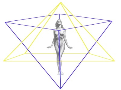 Защита космоэнергета-воина состоит из двух вложенных друг в друга пирамид, одна из которых имеет золотой цвет, а другая — цвет синего золота, при этом последняя перевернута острием вниз. Эти пирамиды отличаются по размерам и способу построения от таковой в обычной защите (см. рис.). Обе защиты взаимоисключающие. Следует также отметить, что при построении защиты космоэнергета-воина положение энергетических центров (чакр) изменяется относительно физического тепа человека, т. е. происходит перестройка ауры. Поэтому неправильная работа в процессе построения и использования этой технологии может вызвать серьезные психические и физиологические нарушения у практикующего.